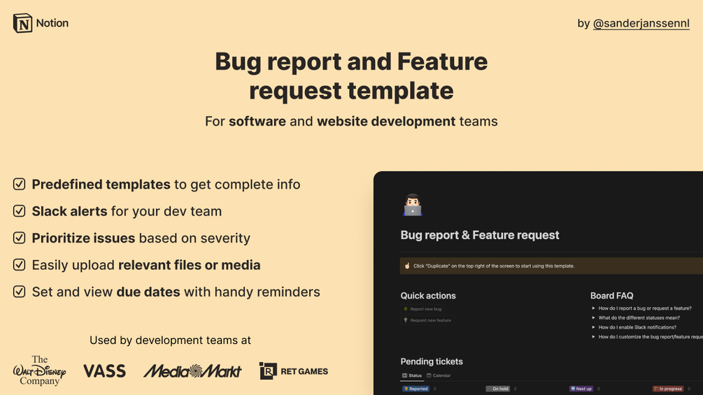 "As a freelance web developer, managing multiple projects, bugs, and features is a challenge. I used to get vague bug reports in my Mail, Slack or WhatsApp all the time. I found myself constantly asking for more details. Now, when a client reports a bug or asks for a feature, they fill out the Notion template. I get all the info I need in one go, saving time and reducing endless email exchanges. I'm sharing this template with you in hopes it'll make your life easier too."