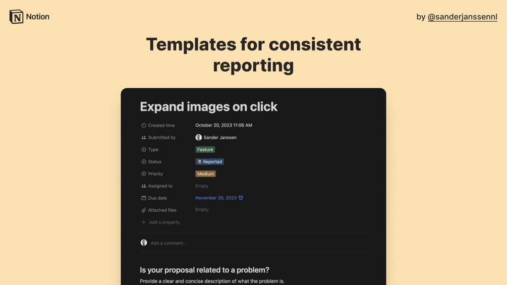 - Quick actions now open the newly made issues straight away (this is a new feature Notion added for buttons), and automatically select the current user as Submitter.